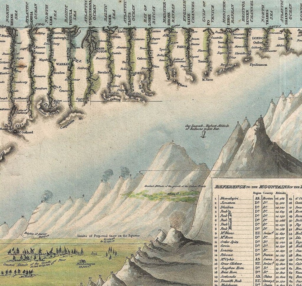 While looking around at images of British maps from the 1820s for The Last Man, I came across an abbreviation I didn’t recognize, rendered as a pleasing pictogram. This was in the key to W.R. Gardner’s “Comparative Heights of the Principal Mountains and Lengths of the Principal Rivers” which is well worth exploring here.