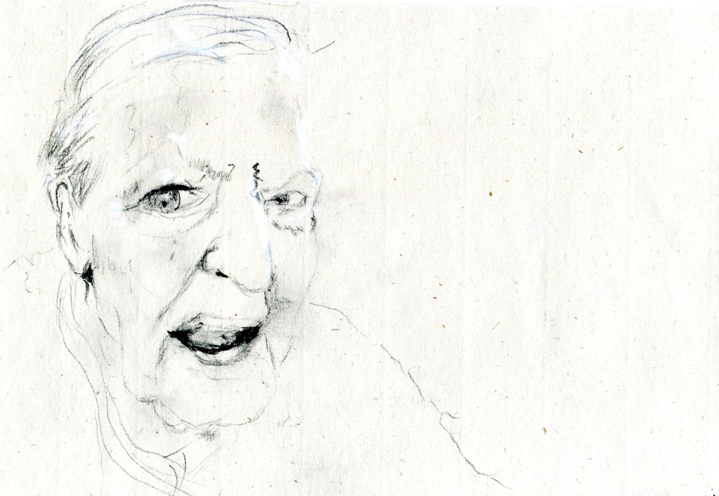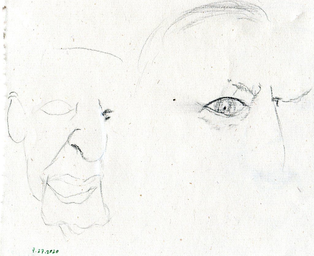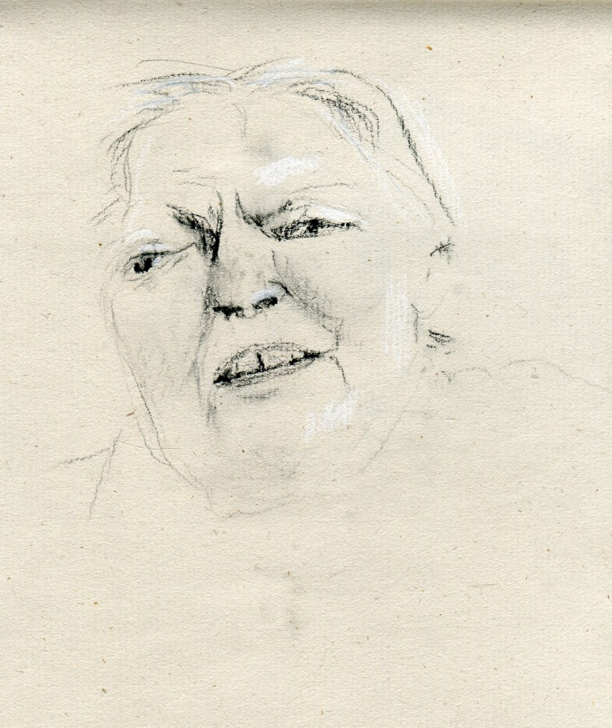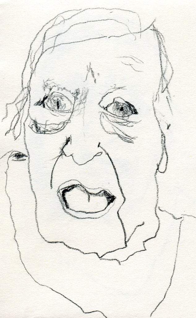 My mother, who survived my father, promised me of her own accord and practically out of the blue each time—for it was more than once she made this promise to me—that she wouldn’t live past ninety. Nevertheless she died at ninety-one. Her last years of widowhood she spent bedridden or sometimes in a wheelchair at the last place she’d have wanted, in a nursing home. Fortunately a very good one; and because her much younger roommate shunned the outside world my mother always got the window and the sun—standoffish inland sun that side of Boston. Starting with the COVID lockdown my sister and I were able to talk to her from our separate apartments in Brooklyn on weekly Skype calls; we’d take screen grabs with noisy clicks that must have bothered her. Maybe I was goading her to say so. She no longer talked, though; so mostly we’d chatter away with the roommate lying out of frame. I sketched my mother off and on from the screen grabs, including a few times with my left hand after she’d died: on a trip up there to gather her things from the nursing home I’d broken my drawing wrist trying to learn pickleball.